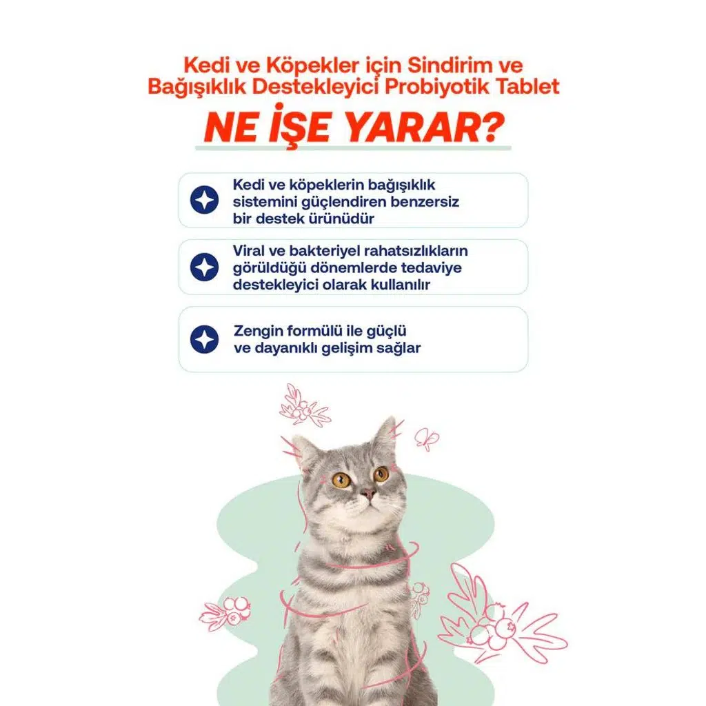 Kediler, köpekler, kuzu ve atlarda bağışıklık sistemini güçlendirmek ve genel sağlığı desteklemek için özel olarak geliştirilmiş tabletler. Beta Glukan, C Vitamini, Ekinezya, Taurin, Propolis, Mürver, Karahindiba ve Lizin içerikleriyle güçlü ve dayanıklı bir gelişim sağlar. Viral ve çeşitli rahatsızlıklara karşı destek sunar.