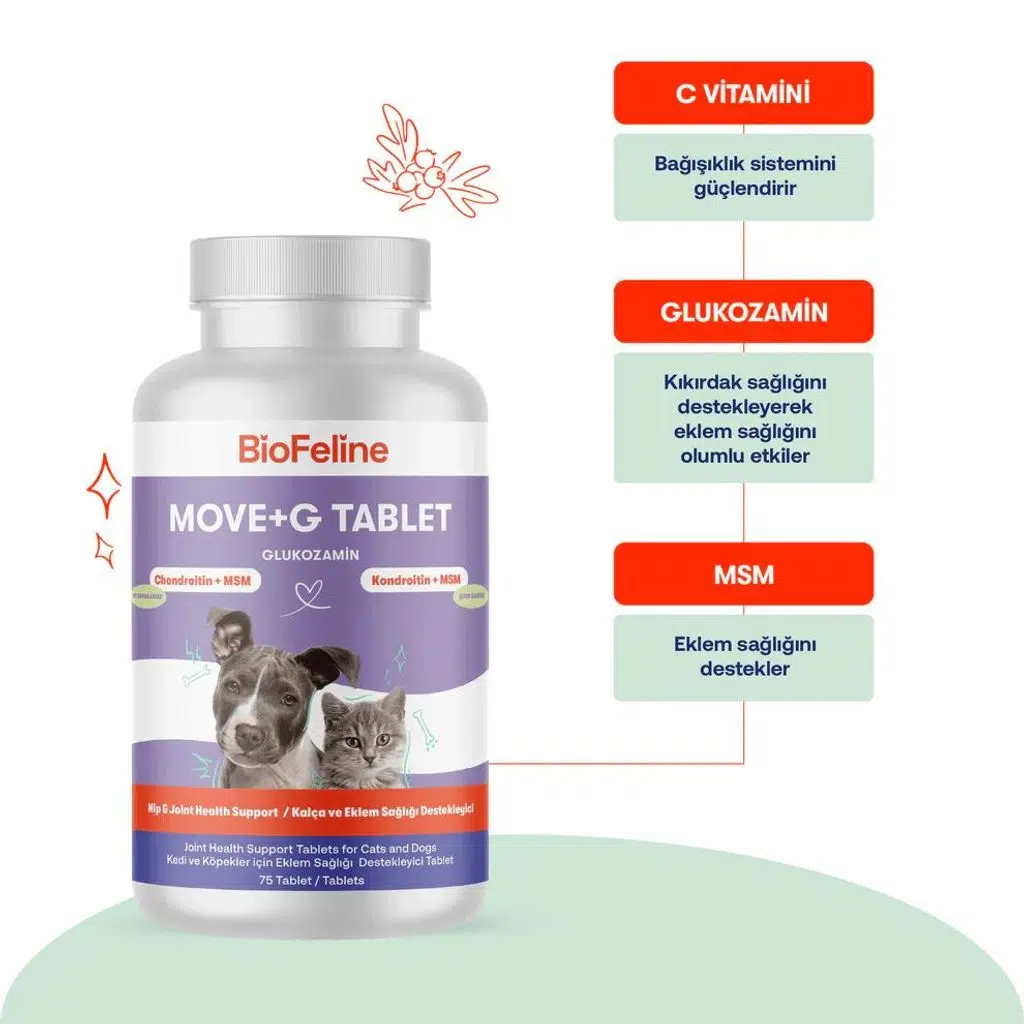 Kediler ve köpekler için özel olarak formüle edilmiş eklem ve kas destek tableti ile sevimli dostlarınızın hareket kabiliyetini koruyun. Glukozamin, MSM ve C vitamini içeriği eklem, kıkırdak ve kas sağlığını destekler, yaşlanma, yoğun aktivite veya fazla kiloya bağlı eklem sorunlarının önlenmesine yardımcı olur. Düzenli kullanımda daha esnek ve güçlü bir kas-eklem yapısı sağlar.