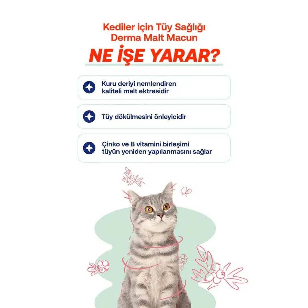 Kediler için özel olarak formüle edilmiş Derma Malt Macun, tüy ve deri sağlığını destekler. Omega 3 ve 6, biotin, çinko ve B vitaminleri sayesinde tüy dökülmesini azaltır, tüylerin daha parlak ve sağlıklı görünmesini sağlar. Spirulina yosunu ile vitamin ve mineral desteği sunar. Şekersiz ve katkısız formülü ile güvenle kullanılabilir.