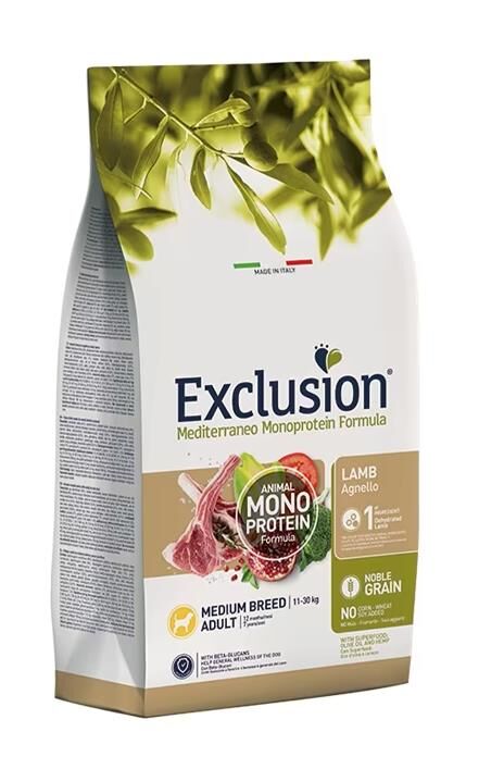 Exclusion Monoprotein Kuzu Etli ve Narlı Düşük Tahıllı Orta Irk Yetişkin Köpek Maması, İtalya'da Üretilmiştir. Mısır, buğday, soya İçermez. Yüksek kalitede tek bir düşük tahıl ile formüle edilmiştir. GDO'suz içerikle hazırlanmıştır. Euglena Gracilis Yosunundan elde edilen ß-1,3 glukanlar, bağışıklık sistemini arttırmaya yardımcı olarak organizmanın sağlığını destekler. Kenevir, zeytinyağı, domates, nar, brokoli ve hindiba, serbest radikalleri nötralize eden ve oksidatif hasardan korunmaya yardımcı olan antioksidanlar bakımından zengindir. Keten tohumu yağı cilt sağlığını ve tüy parlaklığını iyileştirmeye yardımcı olur.