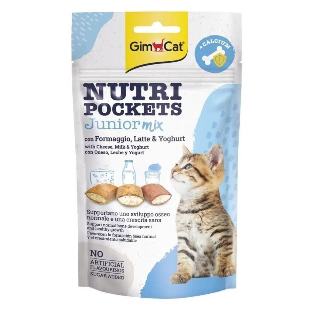 Gimcat Nutri Pockets Junior Mix Kedi Ödülü, özellikle genç kediler için tasarlanmış lezzetli dolgulu çıtır atıştırmalık gevreklerin bir karışımıdır.