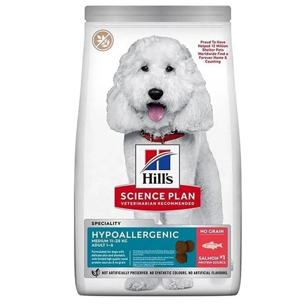 Hill's SCIENCE PLAN Somonlu hipoalerjenik orta yetişkin köpek maması, sınırlı yüksek kaliteli yeni protein kaynakları ile formüle edilmiş ve hassasiyeti olan köpeklerin ihtiyaçlarını karşılamak üzere özel olarak hazırlanmış, tahıl içermeyen nazik bir tariftir.