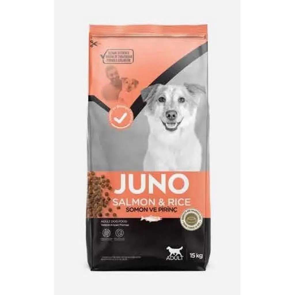 JUNO Somon ve Pirinçli Yetişkin Köpek Maması; yetişkin köpeklerin günlük beslenme ihtiyaçlarını karşılamak üzere formüle edilmiş tam ve dengeli somonlu pirinçli köpek mamasıdır.
