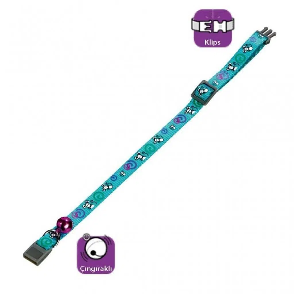 Fare desenli, dayanıklı, naylon kedi tasması. 30 cm uzunluk, 10 mm genişlik. Turkuaz. Tasmayla uyumlu renkte çıngırağı vardır.