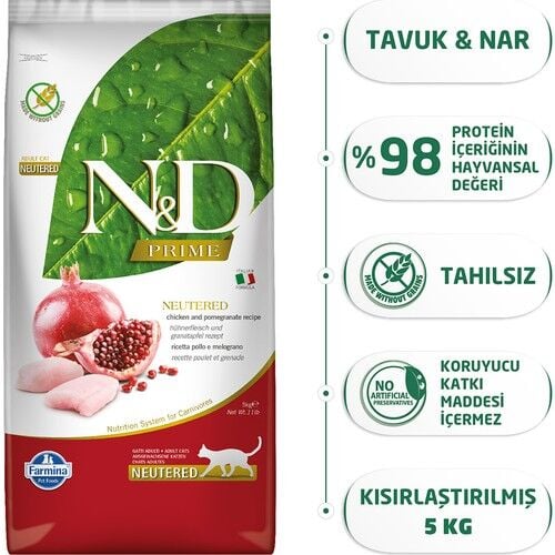 N&D Tahılsız Tavuk ve Narlı Kedi Maması, kısırlaştırılmış yetişkin kediler için özel olarak geliştirilmiş tam ve dengeli bir mamadır. Yüksek proteinli tavuk eti kas kütlesini desteklerken, düşük yağ oranı kilo kontrolüne yardımcı olur.