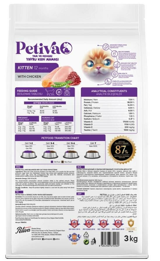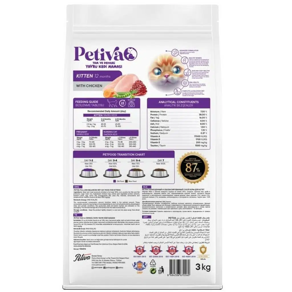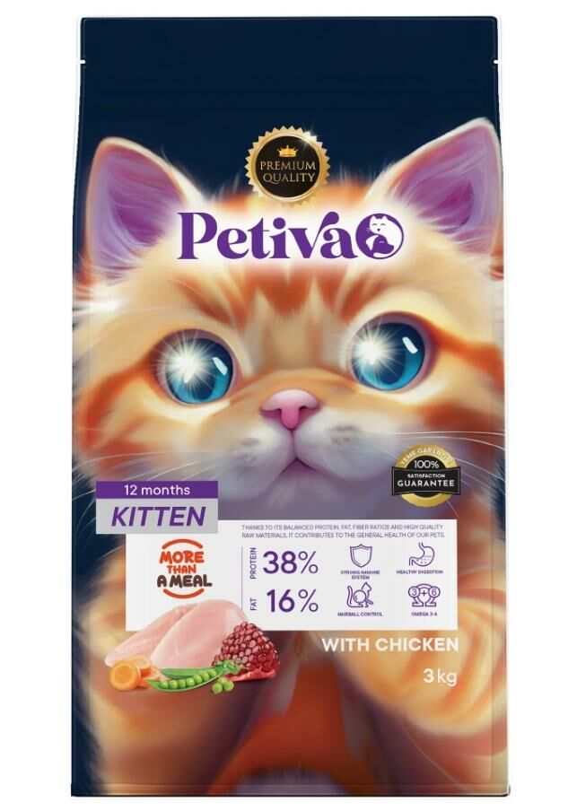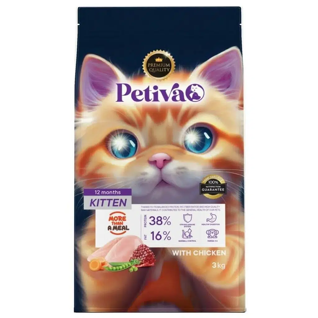 Petiva Yavru Kediler İçin Tavuk Etli Kuru Kedi Maması 3 kg, geniş ambalajı ile uzun süreli kullanım için ideal bir seçenektir. Ekonomik ve pratik bir çözüm sunarak yavru kedinizin sağlıklı ve dengeli bir diyetle beslenmesini destekler.