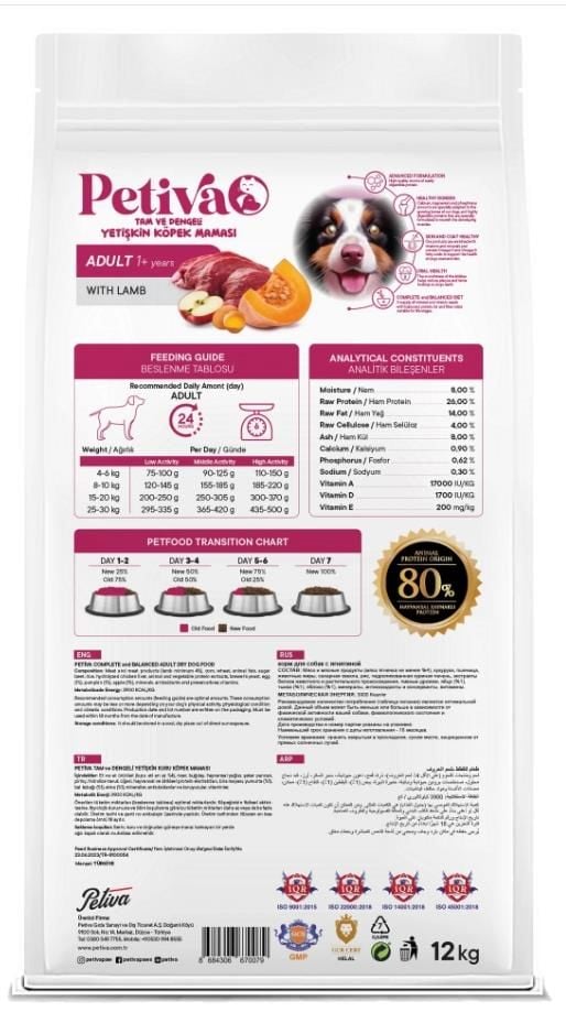 Petiva Yetişkin Köpekler İçin Kuzu Etli Kuru Köpek Maması 12 kg, uzun süreli kullanım için ideal bir ambalaj sunar. Bu büyük paket, hem ekonomik hem de kullanışlı olup, köpeğinizin sağlıklı ve dengeli bir diyetle beslenmesini sağlar.