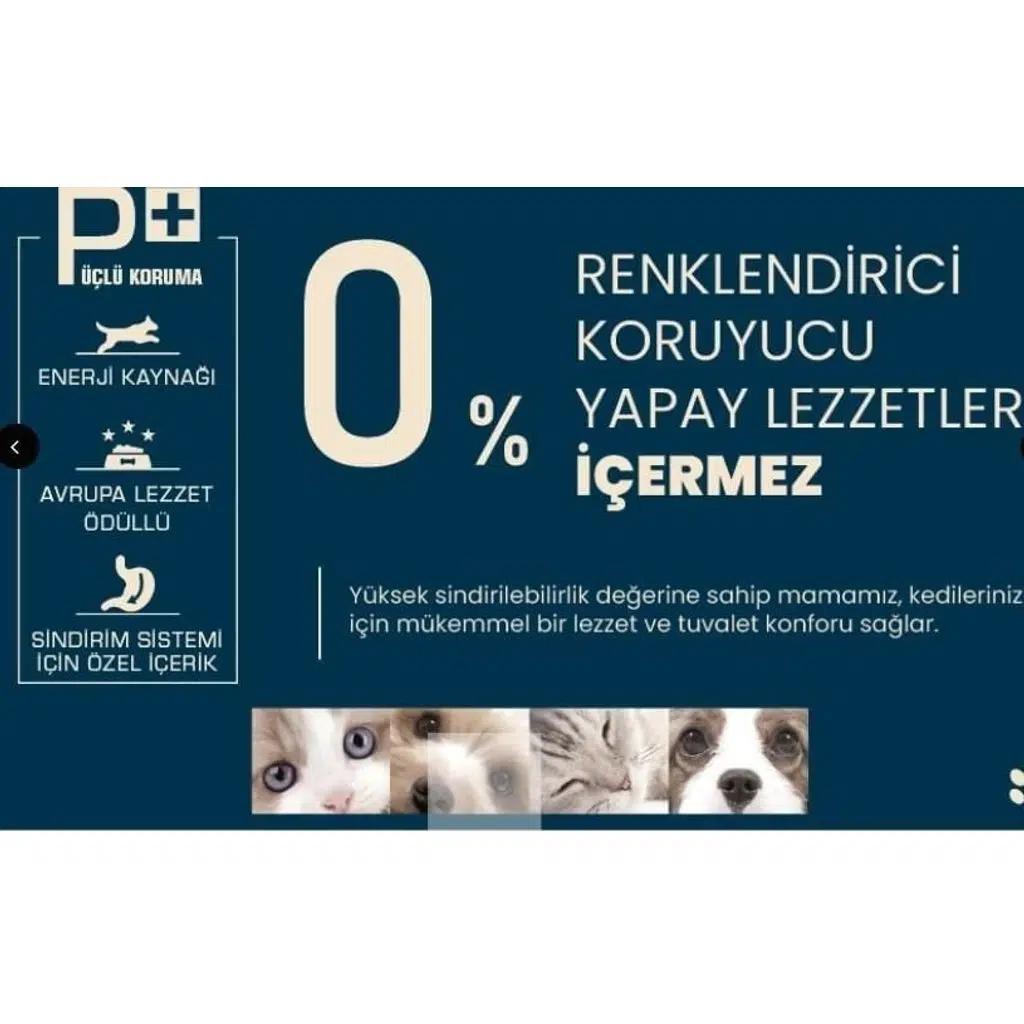 Kurutulmuş hayvansal protein (%24), keten tohumu, elma lifleri (%3), pancar posası, fruktooligosakkaritler.