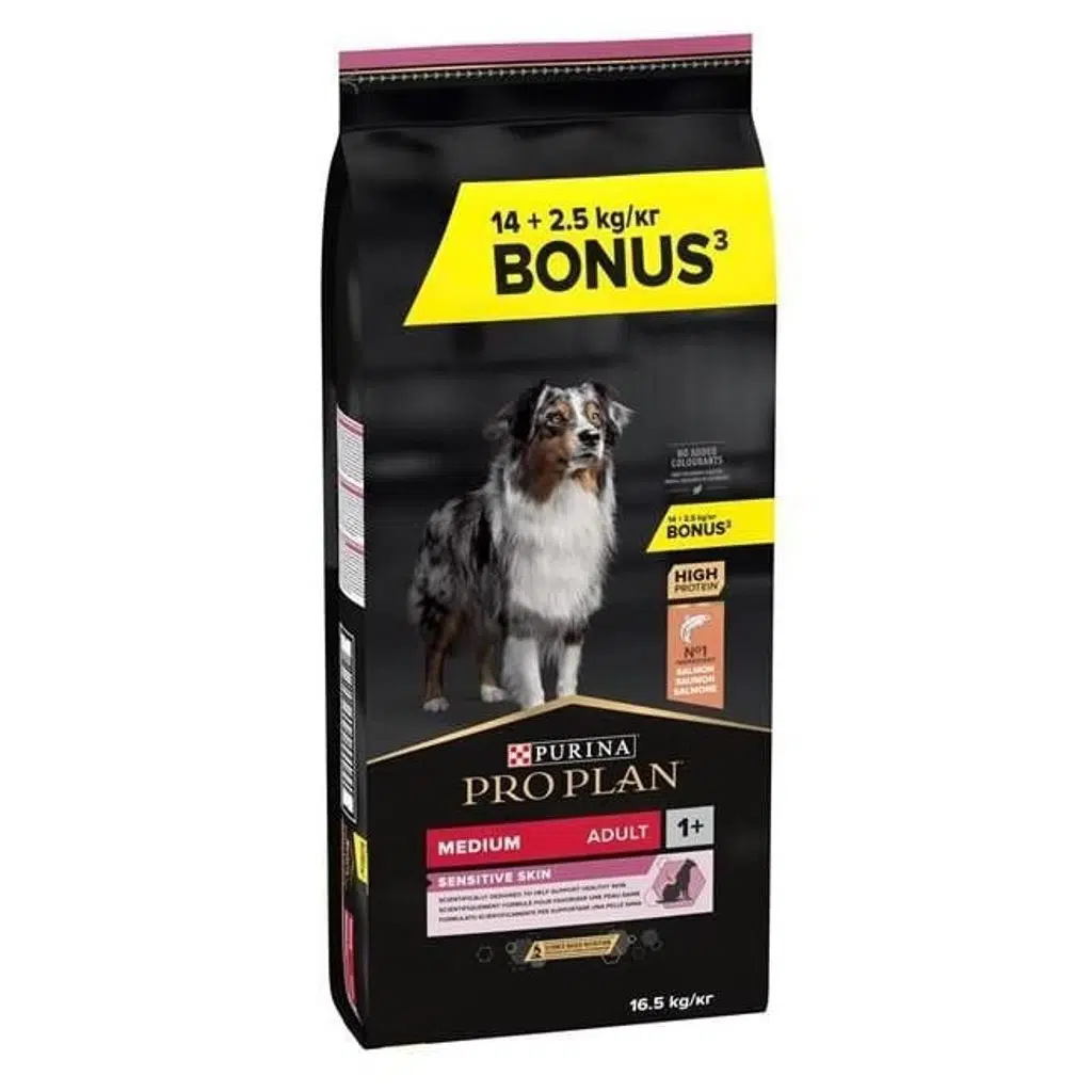 PRO PLAN® Medium Adult Somonlu tam kuru köpek maması, orta ırk yetişkin köpeğinizin bir öğünde ihtiyacı olan tüm besinsel öğeleri içerirken köpeğinizin deri ve tüy sağlığının korunmasına yardımcı olur. Orta ırk yetişkin köpekler için tam kuru köpek maması Parlak tüy ve sağlıklı seri yapısını destekler. Renklendirici ve aroma verici içermez.
