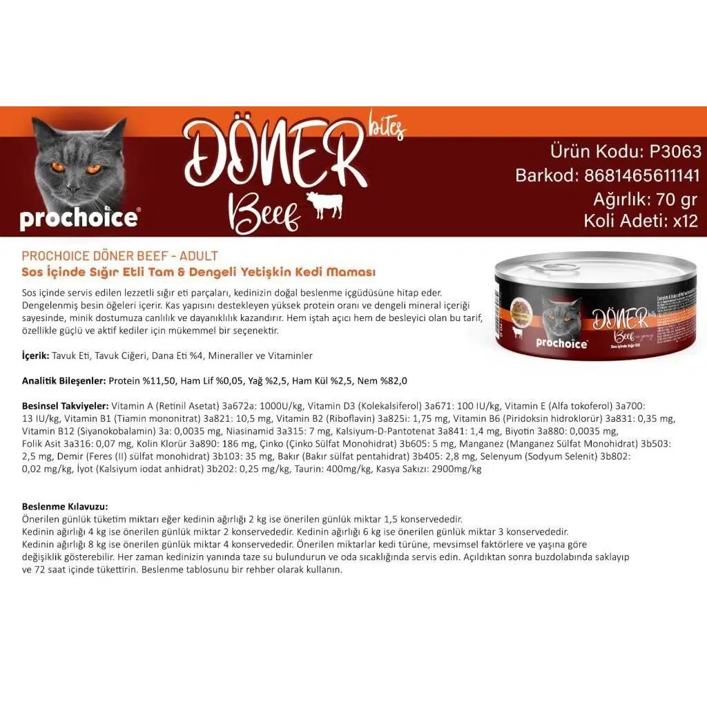 | Etiketler | Prochoice-Prochoice Döner Bites Biftekli Yetişkin Kedi Konservesi 70 GR |