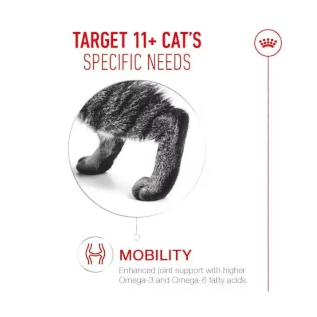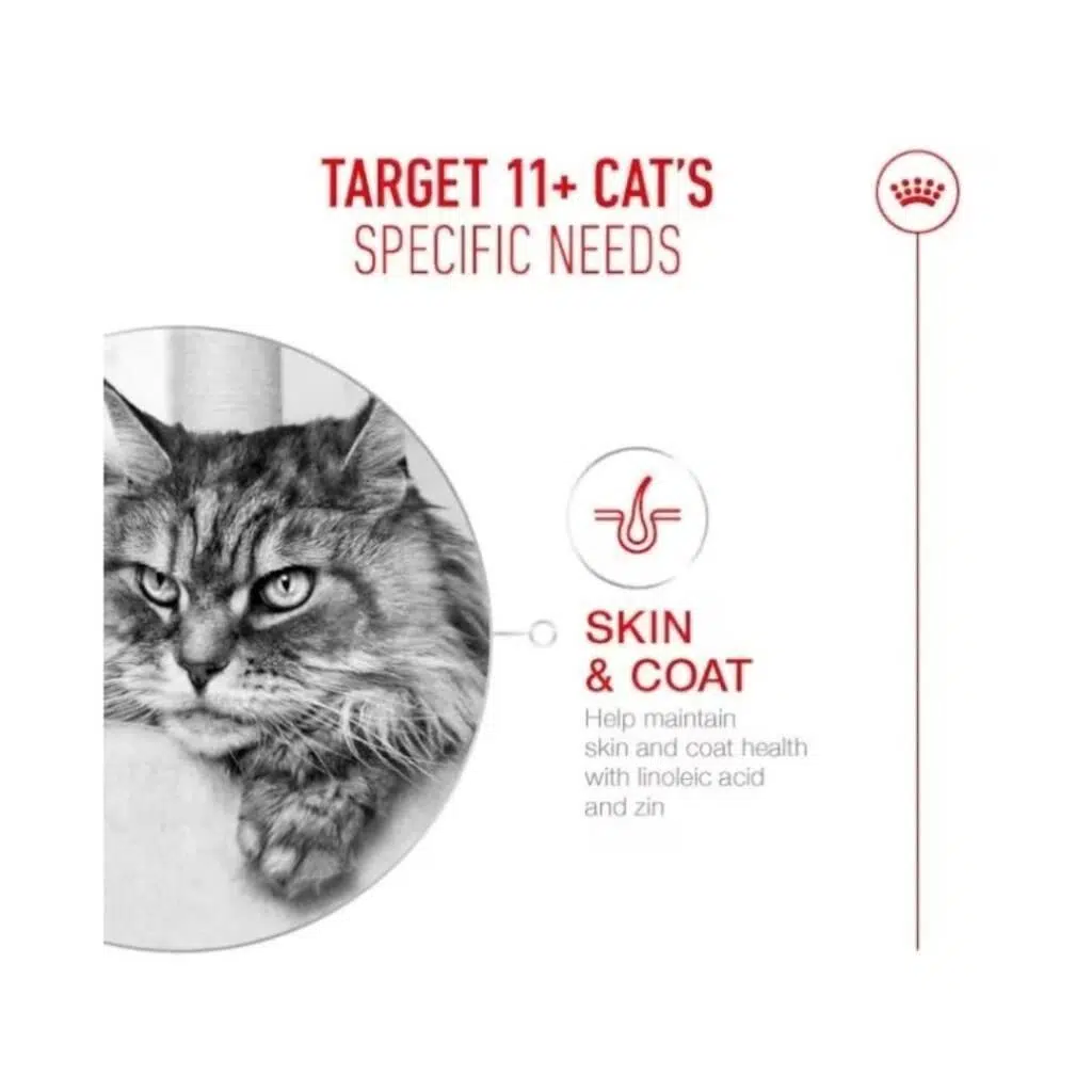 Royal Canin Ageing Cat 11+, 11 yaş ve üzeri kediler için özel olarak formüle edilmiş kuru kedi mamasıdır. Yaşlanmayla birlikte değişen beslenme ihtiyaçlarını karşılamaya yönelik geliştirilmiştir.